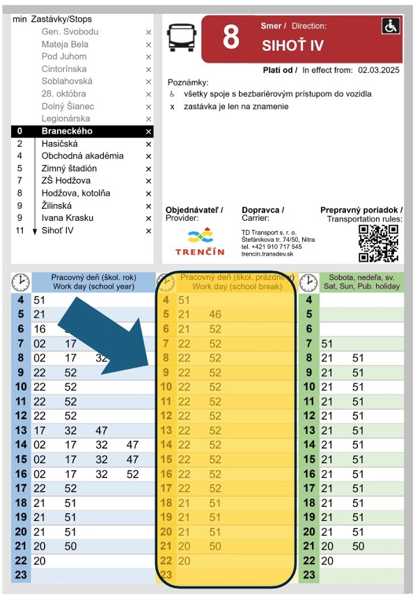 Odchody platné v tento deň sú na zastávkach uvedené v strednom stĺpci odchodov.